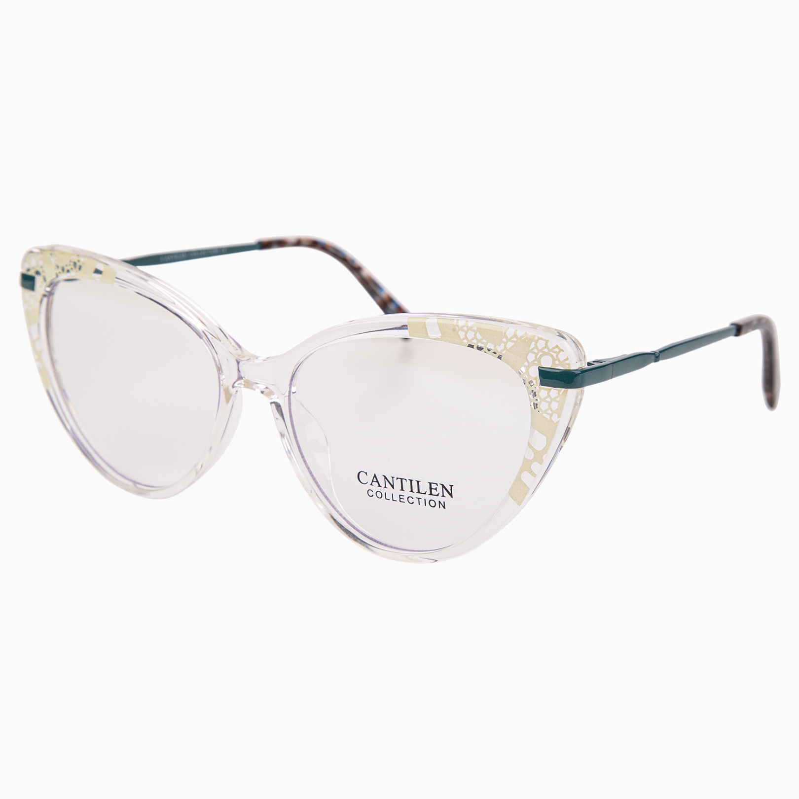 Откройте для себя утончённый стиль с оправой для очков в форме «кошечки»! Эта модель выполнена из прозрачного пластика и украшена спокойным изящным принтом на височной части ободка, что придаёт вашему образу неповторимую изюминку. Металлические заушники в тёмно-зелёном цвете гармонично дополняют общую картину. Такая оправа станет идеальным дополнением к вашему повседневному образу, добавляя в него нотку элегантности и стиля.