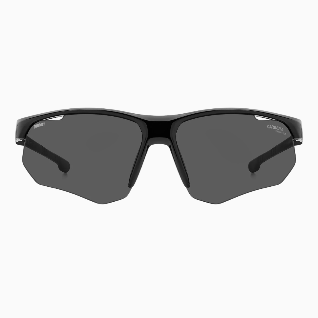 Прямоугольная матовая чёрная оправа подчёркивает брутальный спортивный образ. Большие линзы добавляют футуристичный акцент и усиливают защиту от яркого света. Фирменный стиль Carrera и элементы Ducati делают эти очки заметным аксессуаром для ценителей авто- и мотокультуры.