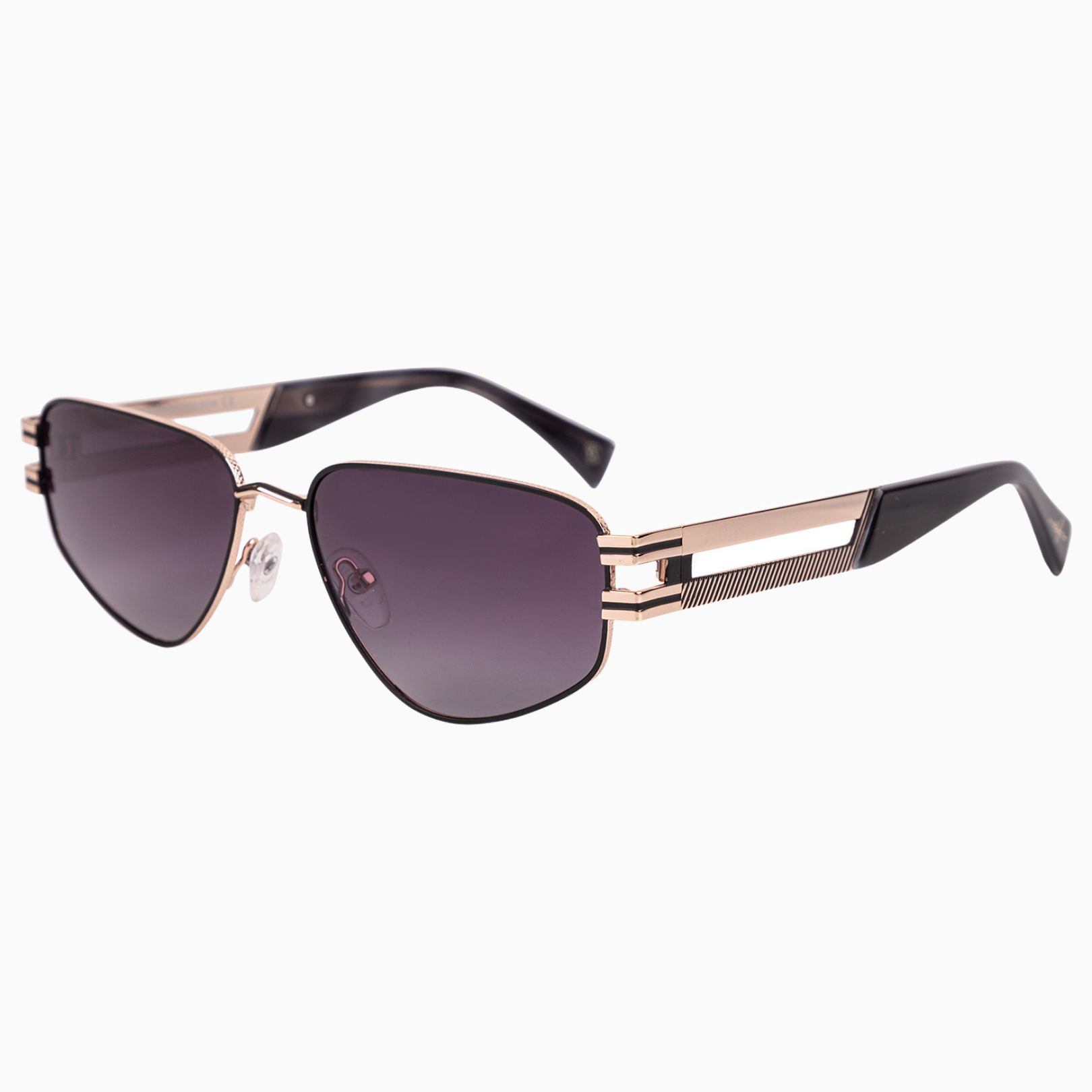 Трендовые солнечные очки. Сочетание геометрической формы линз, широких заушников золотого цвета, исполненных в современном стиле. Популярная модель этого сезона.